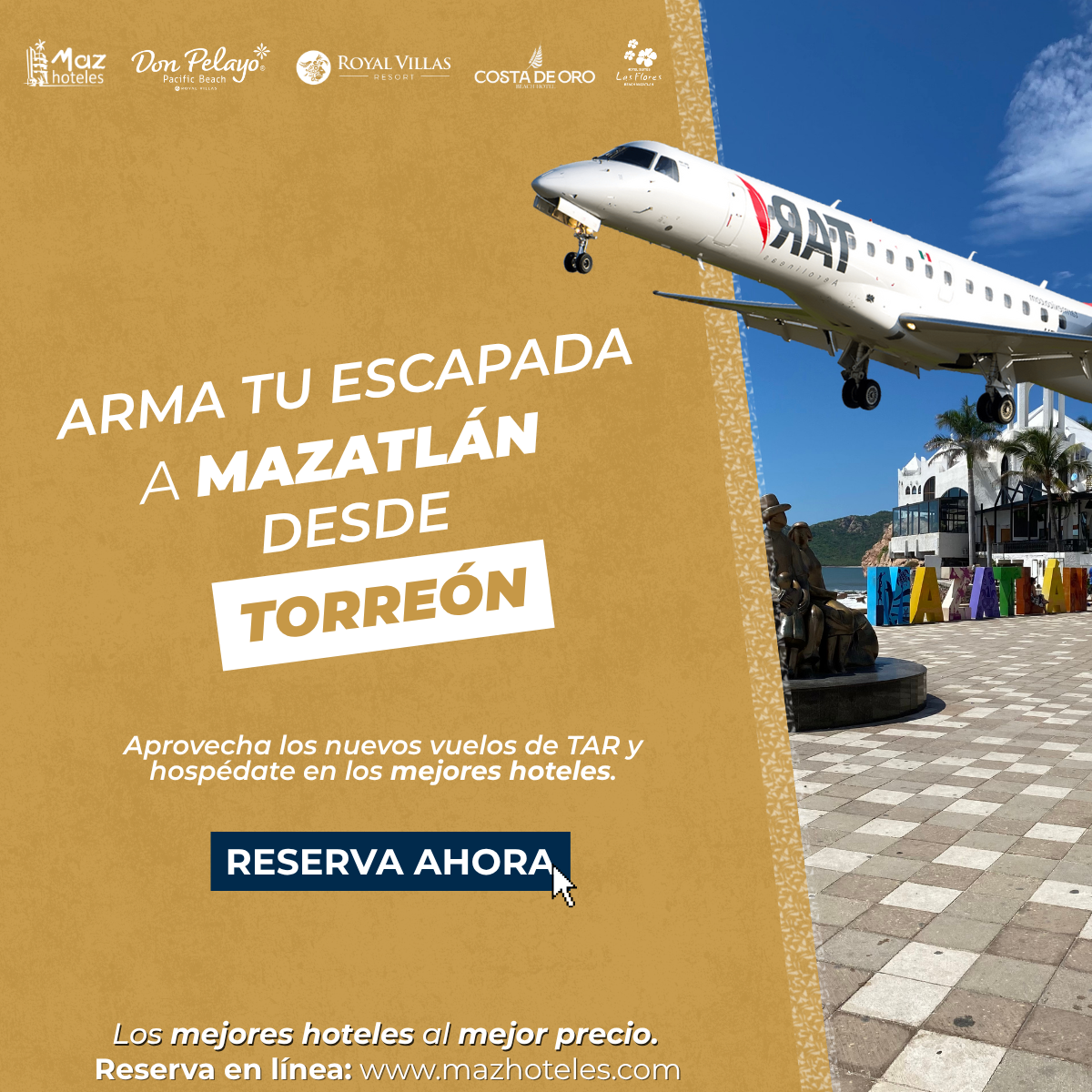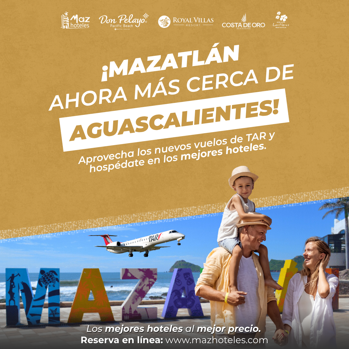 Aprovecha los vuelos de TAR desde Aguascalientes a Mazatlán. ✈️ Hospédate en los mejores hoteles al mejor precio y disfruta playa, descanso y buena ubicación. 🏖️